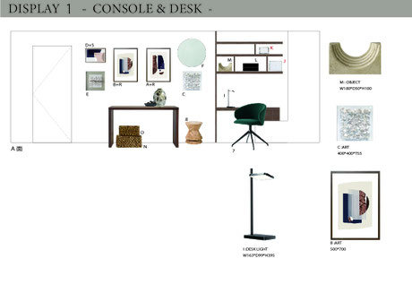 サイドテーブルやフラワーベースなど面積の小さなものには無垢材そのものや石から削り出したような質感を生かしたもの、個性的なデザインのものを取り入れた。さらにアートやチェアの張地などにテラコッタカラーやグリーンなどカラーのアクセントをプラス。さらにグリーンを加えて生き生きとした色と質感の重なりが心地よい空間に。